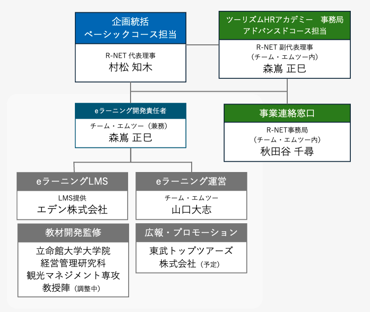 ツーリズムHRアカデミーは、企画主体の(一社)地方創生パートナーズネットワーク、事務局運営の株式会社チーム・エムツーを軸に、学術的な内容監修を立命館大学院経営管理研究科 観光マネジメント専攻 教授陣(予定)が担当、東武トップツアーズ株式会社(予定)が全国DMOや広く都道府県、地方自治体に対し広報・プロモーションを展開するコンソーシアム型教育プロジェクトです。